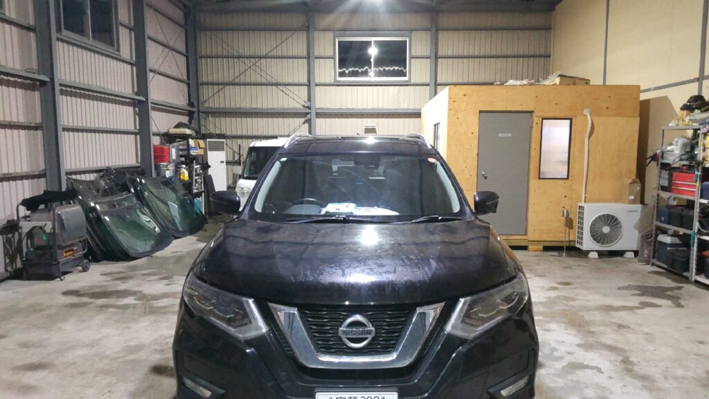 日産 エクストレイルの飛び石が当たってひび割れたフロントガラスのウィンドリペアをさせて頂きました。