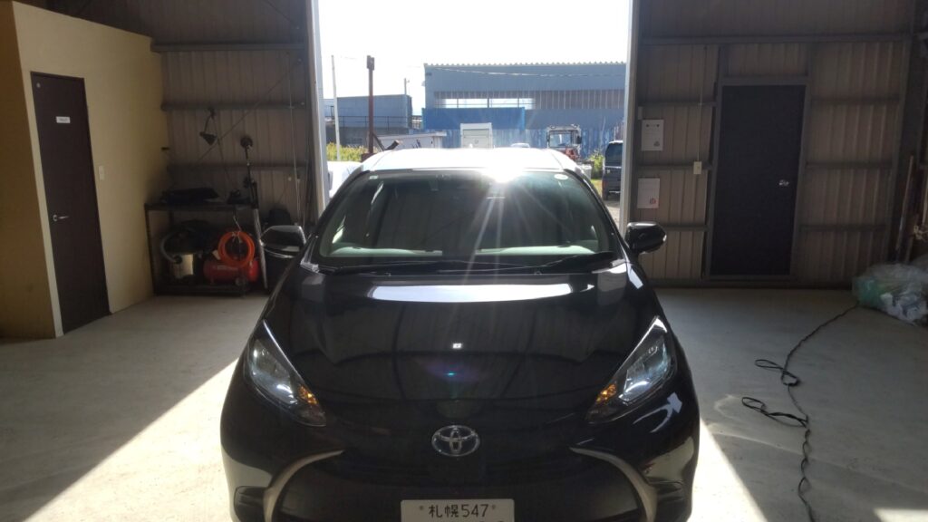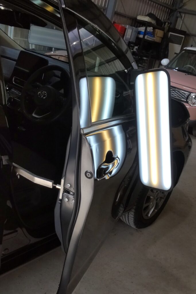 トヨタ アクアのフロントドアのえくぼのへこみのデントリペアをさせて頂きました。