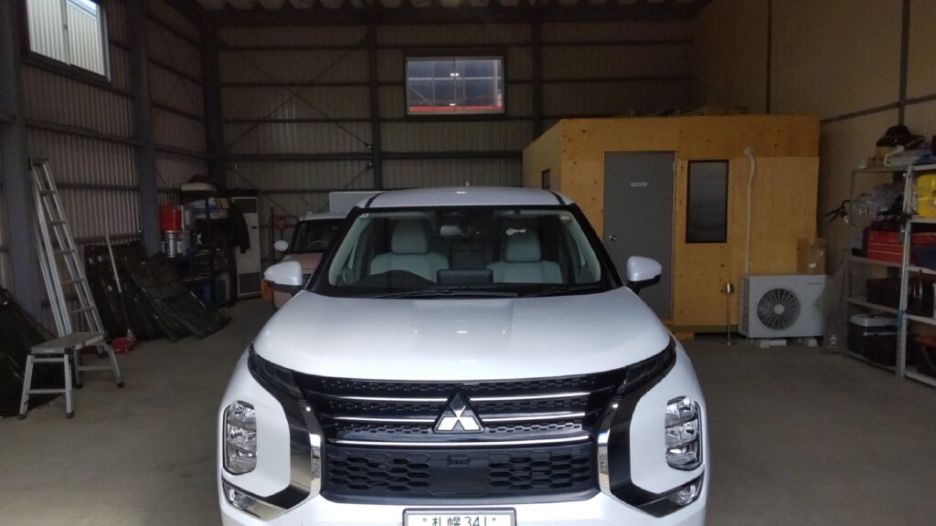 三菱 アウトランダーPHEVのボンネットフード、フロントドア、リアドアの3箇所のへこみのデントリペアをさせて頂きました。