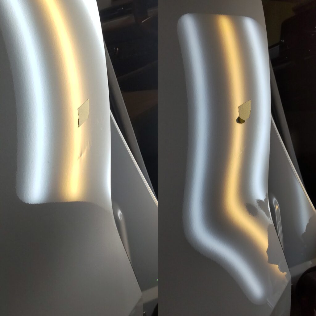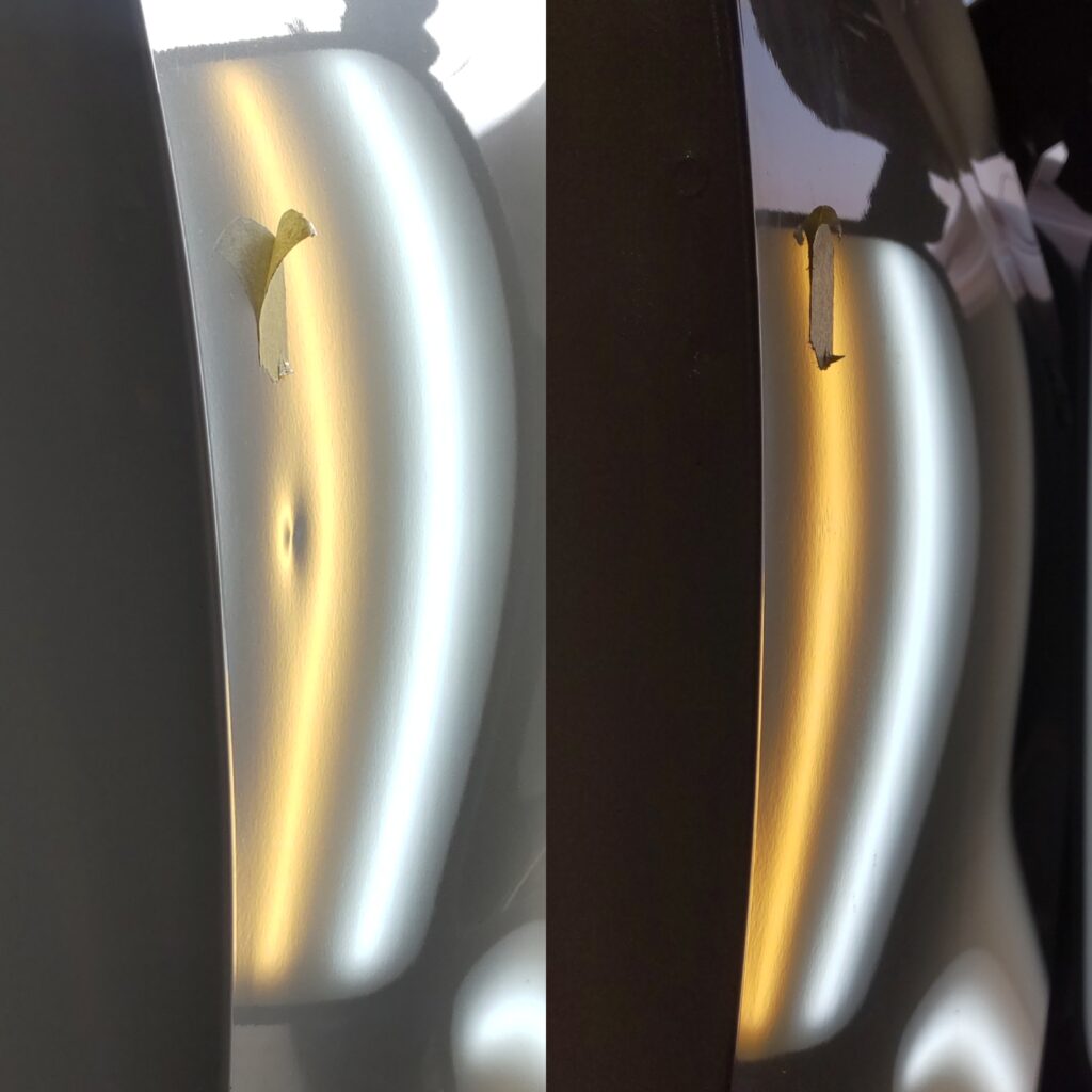 リアドアのへこみは横方向に鋭く引きずったようなへこみで以前、他社様でデントリペアをお願いした時に不完全に修復されていたとの事で、リカバリーの施工をさせて頂きました。