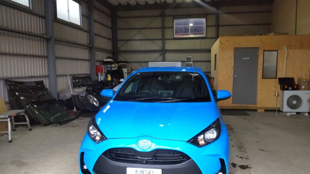 業者様からご紹介のお客様でトヨタ ヤリスのフロントのドアパンチのへこみをデントリペアさせて頂きました。