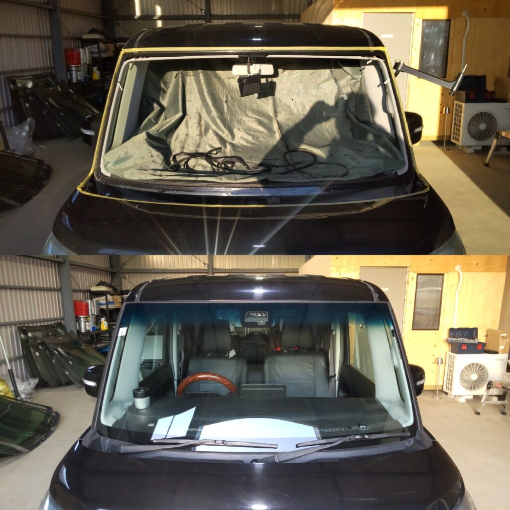 純正フロントガラスと同じ仕様(ブレーキサポートカメラ対応、ぼかし付、JIS規格品、UV/IRカット付)で半額程度の新品輸入フロントガラスに交換させて頂きました。