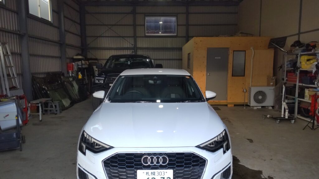 Audi A3のフロントドアのドアパンチのへこみをデントリペアさせて頂きました。