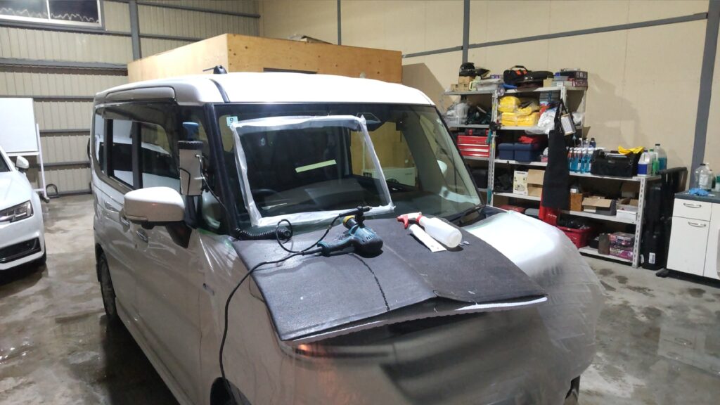 スズキ スペーシアカスタムのフロントガラスの傷取り研磨