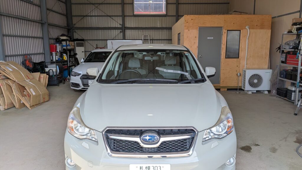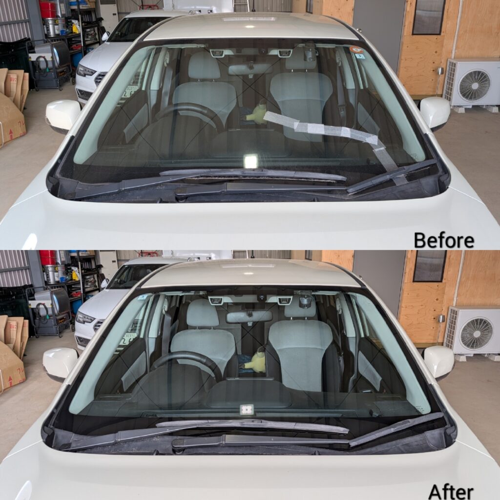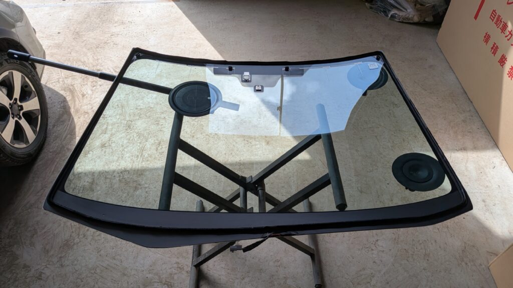 純正フロントガラスと同じ仕様で半額程度の(アイサイト対応、寒冷地仕様、レインセンサー対応)新品輸入フロントガラスに交換させて頂きました。