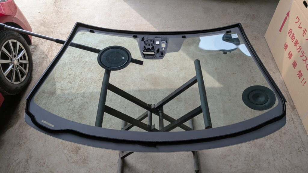 純正フロントガラスと同じ仕様で半額程度のブレーキサポートカメラ対応、レインセンサー対応の新品輸入フロントガラスに交換させて頂きました。