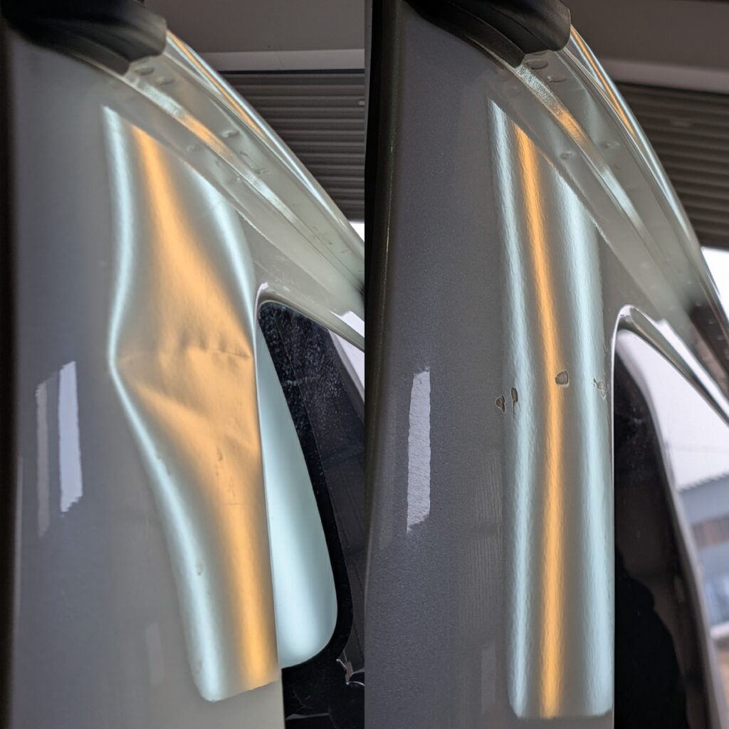 へこみ裏側からのツールアクセスができず、プーリング(表側からの引っ張り出し)での施工になるのでお客様に塗装の劣化で剥がれるかもしれないリスクを了承頂き、塗装が剥がれてもお客様のお知り合いのお店で後で塗装して貰うとこの事で施工させて頂きました。
