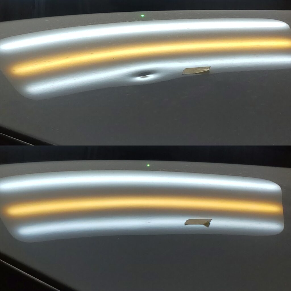 お客様のご実家が自動車板金塗装業を行っているとのことでしたが今回傷無しのへこみだった為、塗装を残してへこみを直したいという思いから当店を選んで頂きました。